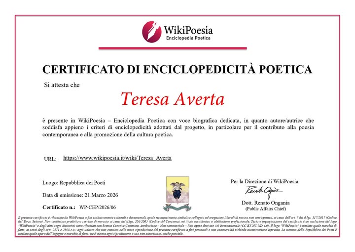 Un nuovo e prestigioso traguardo arricchisce il percorso artistico e intellettuale di Teresa Averta. Alla nota scrittrice, poetessa e docente calabrese è stato ufficialmente conferito il certificato di "enciclopedicità poetica" da parte di WikiPoesia. Un riconoscimento di altissimo profilo culturale, assegnato dal Presidente del progetto, il dottor Renato Ongania, che va a suggellare anni di intensa attività letteraria e divulgativa.